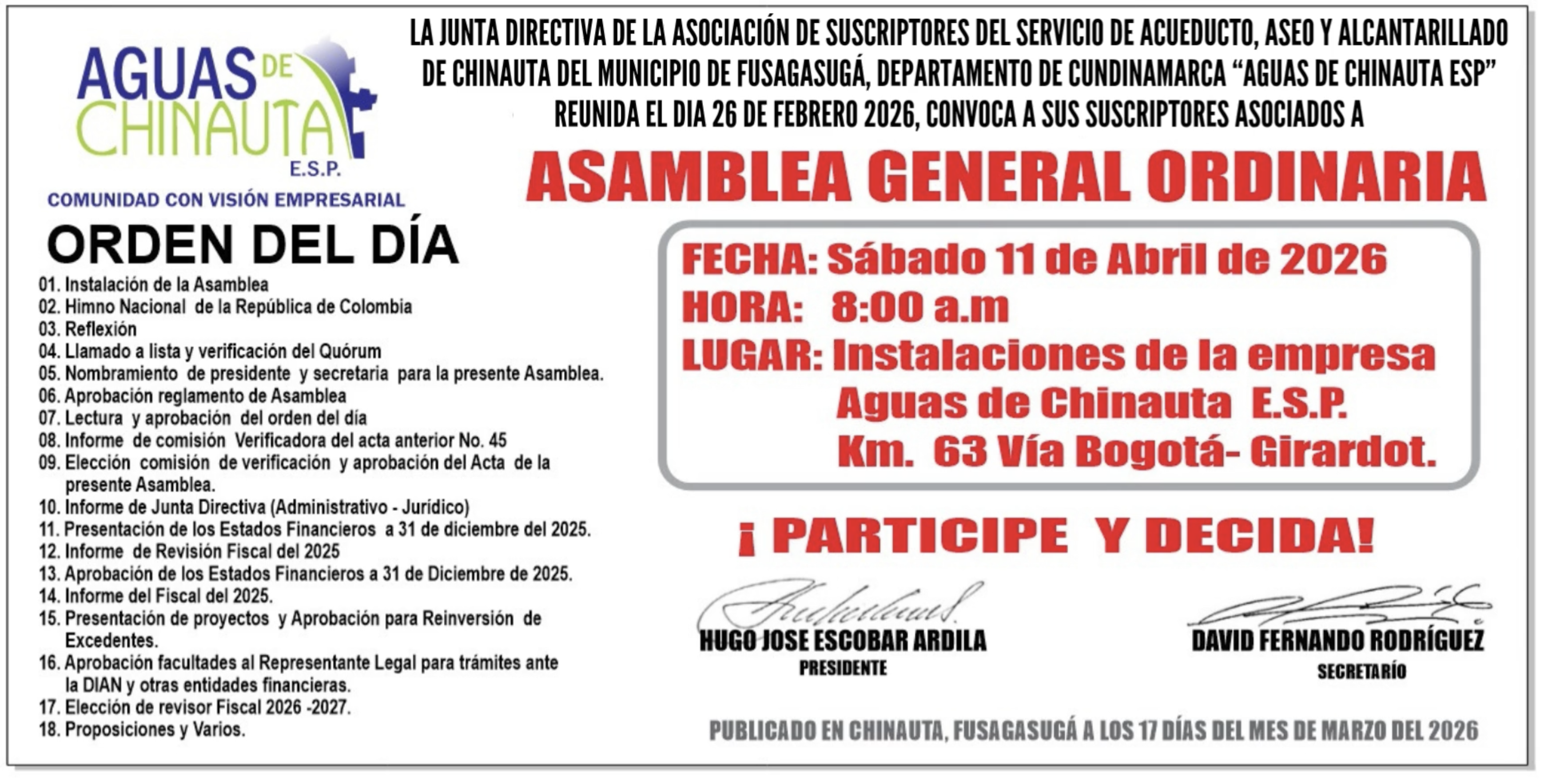 La Junta Directiva de la Asociación de Suscriptores del Servicio de Acueducto, Aseo y Alcantarillado de Chinauta del municipio de Fusagasugá, Departamento de Cundinamarca Aguas de Chinauta E.S.P. convoca a sus suscriptores asociados a Asamblea General