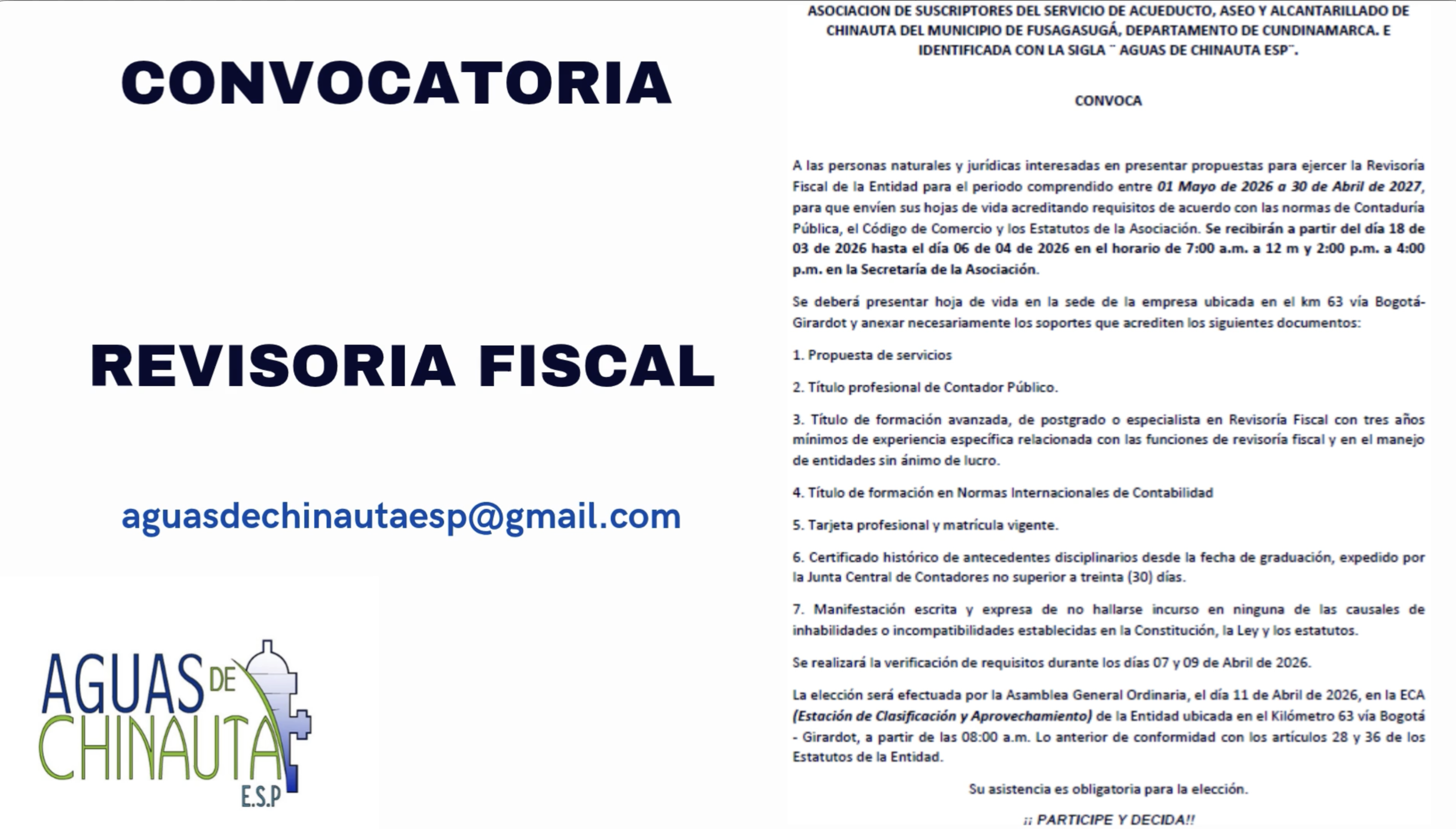 Convocatoria revisorÃa fiscal de la entidad para el periodo comprendido entre el 1 de mayo de 2026 a 30 de abril de 2027, se recibirán hojas de vida a partir del 18 de Marzo de 2026, hasta el 6 de abril de 2026 en el horario de 7:00 a.m. a 12:00m. y 2:00 p.m. a 4:00 p.m. en la Secretaria de la Asociación.