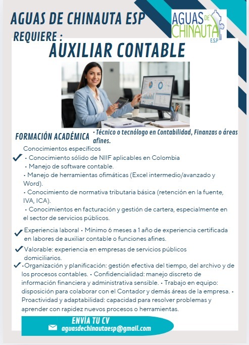 Se requiere Auxiliar Contable. Buscamos una persona organizada, responsable y con conocimiento en NIIF, software contable y manejo de herramientas ofimaticas. Convocatoria abierta hasta el 7/11/2025.